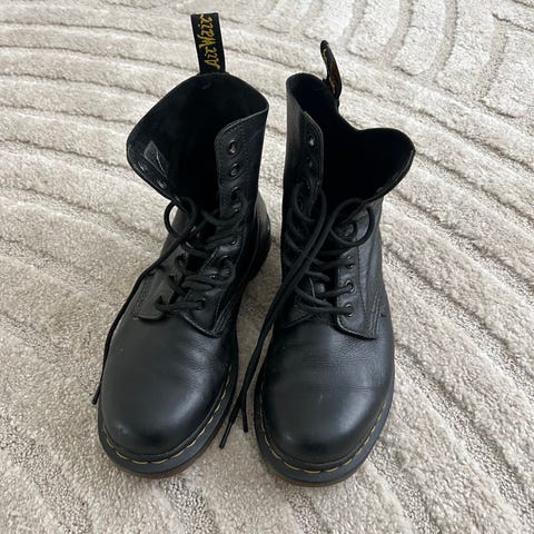 Myydään mustat, erittäin hyväkuntoiset, vain pari kertaa käytetyt Dr. Martens -kengät. Käytännössä kuin uudet. Koko 40. Keltaisella tikkauksella AirWair-logo takana.