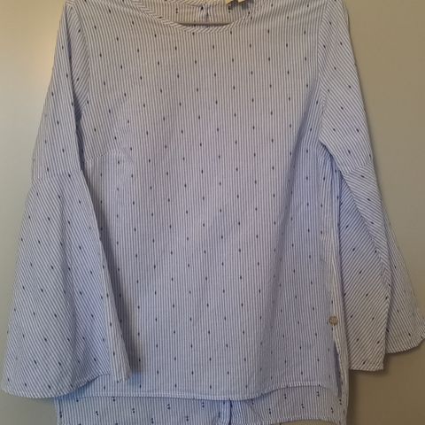 Hyväkuntoinen italialainen Maria Bellentani raitatoppi. Materiaali hyvinlaskeutuva 95 % viskoosi, 5 % elastan. Pyöristetty helmalinja, jossa rullakäänne. Sivusaumoissa ja hihan alasaumassa kapeat sinapinruskeat rullakäänteet. Koko S.