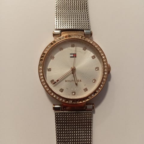 Tommy Hilfiger ruusukullan värinen rannekello. Rannekellon ympärysmitta sisäpuolelta n.18cm. Saa lyhennettyä ottamalla paloja pois. Rannekkeen leveys 1,5cm. Kellotaulun halkaisija 3,5cm. Käytetty on ja jälkeä löytyy, kts kuvat. Kellotaulussa yksi timantti on pudonnut hieman syvemmälle kuin muut. Patteri vaihdettu 7/24, säilytetty nuppi ylös vedettynä. Kuvissa kuvattuna mustan ja valkoisen säilytystyynyn päällä, mukaan tulee musta tyyny. Pk 8,90.