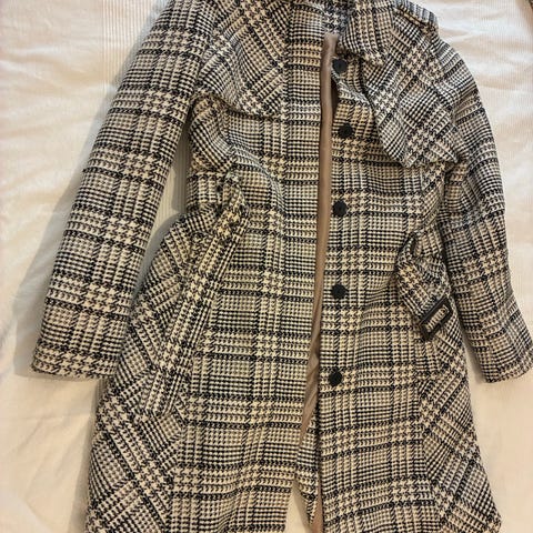Mustavalkoinen Mascaran takki kokoa 36 mutta menee 38 kokoiselle ja hihat ei jää lyhyeksi. Keltainen vuoritus. Kaulus muokkautuu moneen asentoon. Tyylikäs helman muoto. Kangastakki, vuoritettu ja sopii syksyyn ja kevääseen. Ei siis ole villakangastakki.