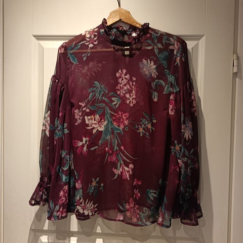Kaunis vaaleanliila pikku kukkainen paita. Ylhäällä jousto rypytys, hihoissa solmittavat nauhat. Oikein hyväkuntoinen. Pesulappu leikattu pois mut viskoosia ilmeisemmin on.