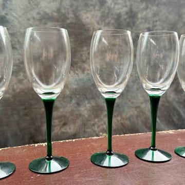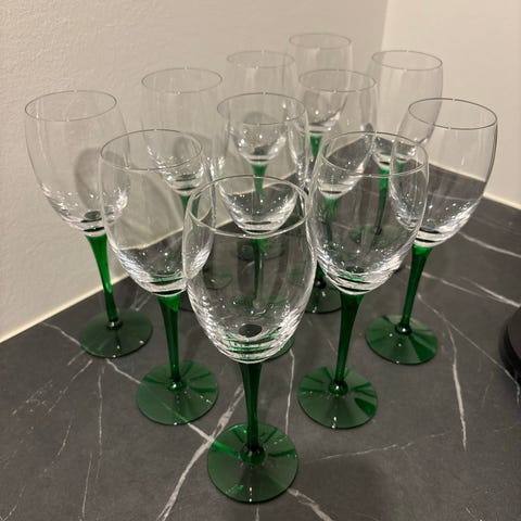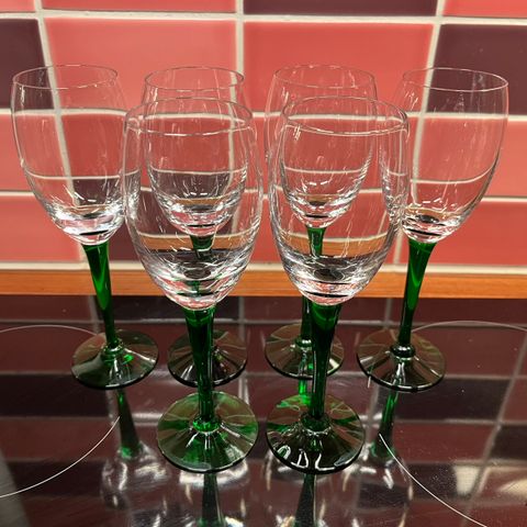 Saara Hopean Nuutajärvelle suunnitteleman Traviata-malliston 8 kpl valkoviinilaseja ja 2 kpl punaviinilaseja.