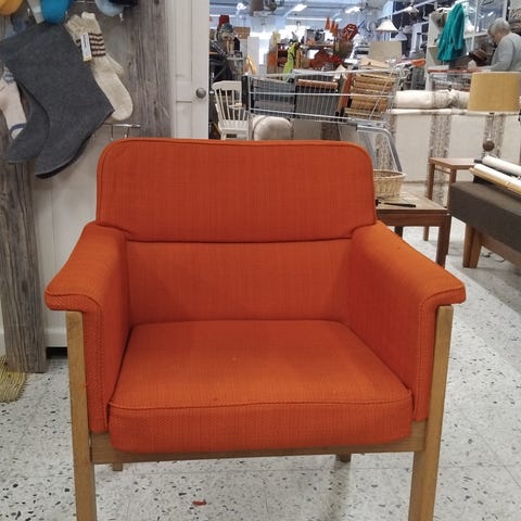Eero Aarnion suunnittelema upo tuoli. Tuolissa pieniä naarmuja ja istuinosan pohjassa halkeama, tuoli kestää silti istumisen.