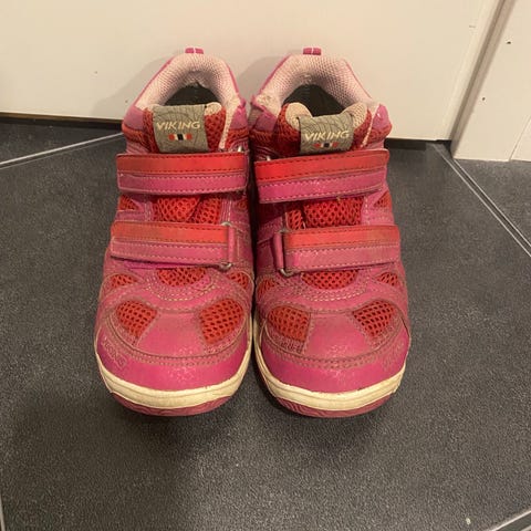 Viking Odda low pink lenkkarit. Koko 30, pohjallisen mitta 19,5cm. Ehti olla vain alle 2 kk kesällä käytössä muiden kenkien ohella. Erinomainen kunto, tarrat pitää yhtä napakasti kuin uutena. Ainoat viat on tummentumaa pohjallisissa ja pienet kulumat kengän yläosassa. En ole jynssännyt puhtaaksi, ettei kulu, joten myös jotain muuta pientä jälkeä saattaa olla.