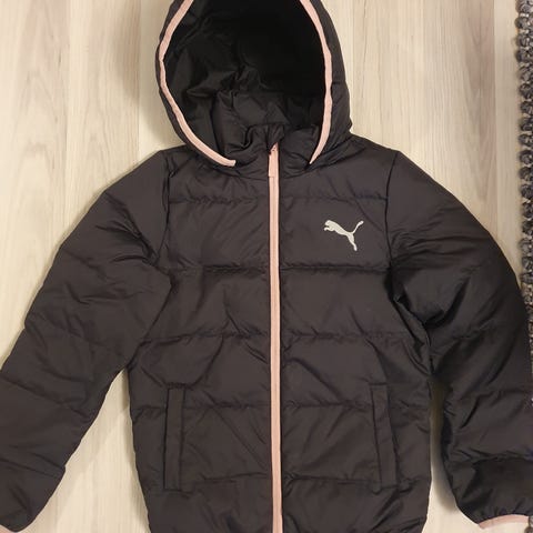 Musta Puma untuvatakki koko 140 cm. Hyvä pitempi malli pitää lämpimänä. Hihoissa valkoinen raita. Huppu painonapeilla. Edessä vetoketju ja tarrallinen tuulilista. Nimikoimaton ja siisti. Pesty käytönjäljiltä asianmukaisesti.