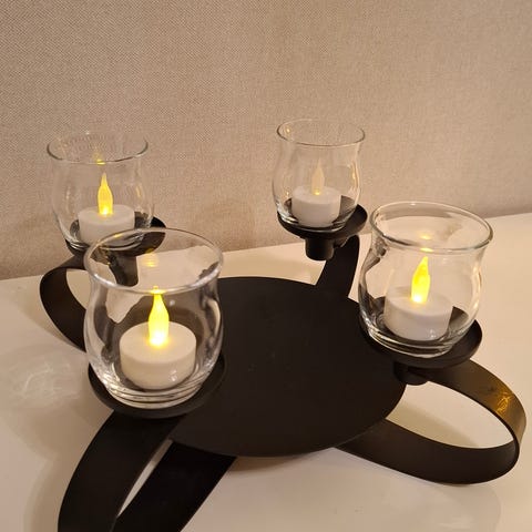 Kynttiläsermi / kynttiläseinä tuikkukynttilöille, mukaan 6 lasikippoa. Kolmiosainen, saranoilla, kätevä taitella omaan silmään ja tilaan sopivaksi. Todella kaunis ja näyttävä, siisti ja hyväkuntoinen. Pimenevään syysiltaan tunnelmaa. Runko metallia, tukeva. Korkeus n. 52cm leveys leveimmillään n. 82cm.