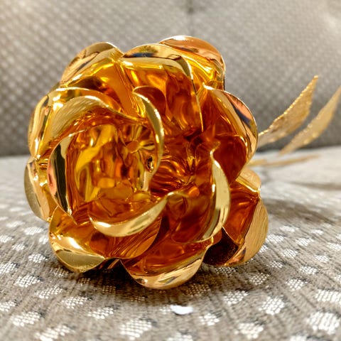 Myynnissä kaksi uudenveroisessa kunnossa olevaa juhlaruusua. Materiaali metalliseosta, pinta kullattu. Varressa on neljä terälehteä. Pituus noin 32 cm, ruusun halkaisija noin 6 cm.