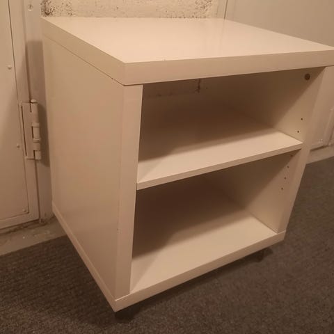 Hyllyjä on 2kpl ja molemmissa on kaksi säilytyskoria jotka voi ottaa pois, siirtää tai käyttää muuhun tarkoitukseen. Hyllyistä pyyhitään pölyt ja liat ennen myyntiä huolella.
