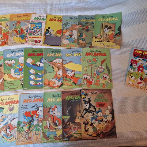 70-luvun Aku Ankkoja. Kunto vaihtelee, osa hyvässä kunnossa, osassa kansi voi repsottaa, jossain saattaa olla jotain merkintöjä. Lehdet luettavissa kuitenkin. Voin myydä myös erikseen. Kysy jos joku tietty lehti kiinnostaa. Vuoden 76 lehdet myyty.