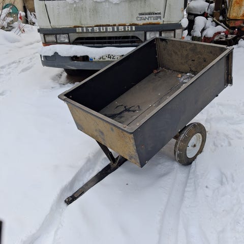 Mönkijän peräkärry uusilla renkailla ja pyörivällä vetolenkillä lavan koko 120x80 laita korkeus 25cm pääty laidat nousee pois sisällä ritilä pohja ja kippaava