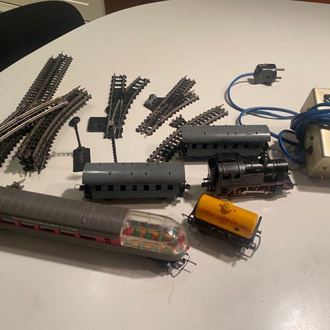 Vanha Trix Express-pienoisrautatie ja tarvikkeita maisemointiin,osa alkuperäispakkauksissa.
