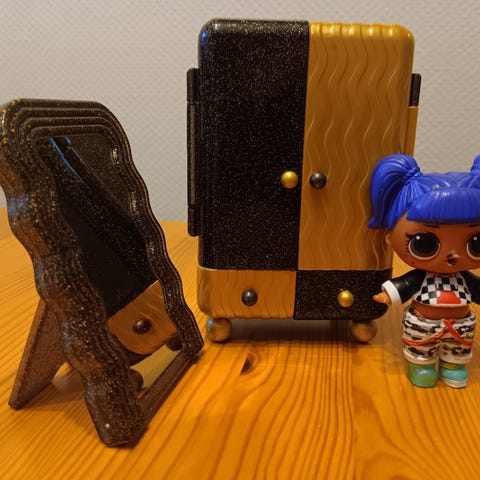 Levysoitin, jossa musiikki kuuluu, kun levyn asettaa paikoilleen. Nukke ja pikkutavarat mukana.