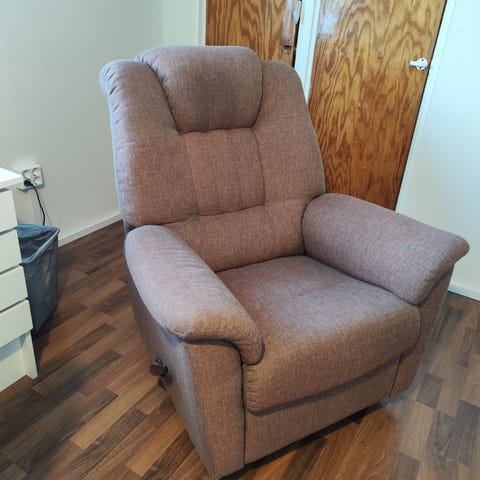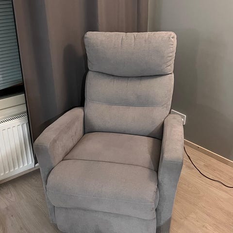 Mukava nahkainen mekanismituoli myynnissä. Mukava istua mutta vähän turhan iso omaan nykyiseen asuntoon. Mekanismilla nousee jalkatuki ja sekä selkänoja taittuu noin 45 astetta taakse.