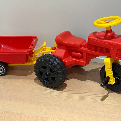 Plaston traktori peräkärryllä. Ulkoleikkiin kai tarkoitettu,mutta meillä ollut sisäkäytössä. Polkinet eivät pyöritä eturengasta, jotain vialla? Korjaustaitoiselle. Muuten erittäin siisti.