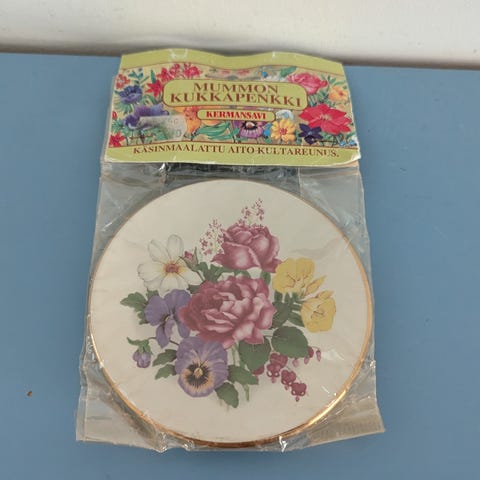 Kuvassa signeeraus EL. Takana teksti Osuuspankki eli ollut ilmeisesti Osuuspankin liikelahja. Tekstin alle kirjoitettu käsin vuosiluku 1991 eli olisiko saatu tai valmistettu silloin.
