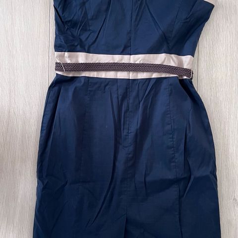 Espritin kotelomekko. Valkoisia palloja tummansinisellä pohjalla. Hieman joustava puuvillakangas, tummansininen vuori. Kerran käytetty, erittäin hyvässä kunnossa. Koko 36.