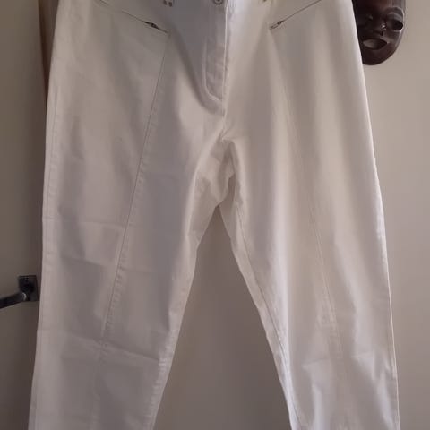 Myydään kuvan vaaleanbeiget housut, joissa miellyttävä joustava kangas.