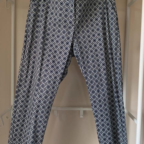 Myydään kuvan tummansiniset housut, joissa vyötäröllä joustokumpparit.