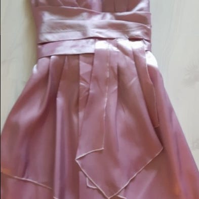 Puolipitkä juhlamekko, jossa kiinnitys napilla niskan taakse. Koko napakka 42. Materiaali ei jousta. Mekkoon kuuluu vyö, jossa ruusu.