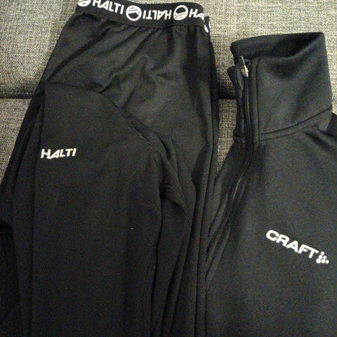 Graft, naisten ulkoilu asu, koko L. Oikean lahkeen pieni rispaantuninen korjattu tekstiiliteipillä nurjalta. Housujen lahkeissa pitkät vetoketjun.
