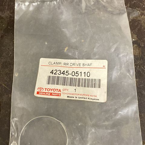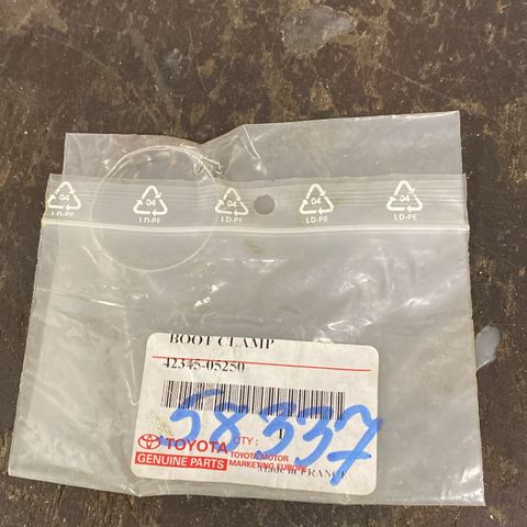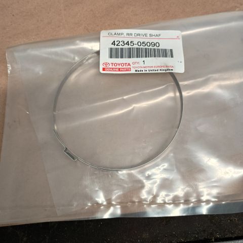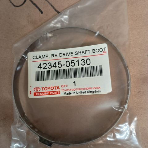 Myydään Toyotan uusi ja alkuperäinen osa, osanumero 42345-05140 (CLAMP, RR DRIVE SHAFT B , (CLAMP (FOR FRONT AXLE OUTBOARD JOINT BOOT RH)), Vetoakselin ulkopään murroksen kumin pienempi klemmari). Sopivuus: