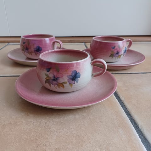 80 -luvun lopulla Ruotsista savityöpajasta ostettu teekuppipari asetteineen. Vaaleat astiat on lasitettu ja koristeltu tummanruskein, graafisin kuvioin. Kupin pohjassa on käsityöläisen puumerkkinä Kristina, Gendalen ja vuosiluku 87. Asetin halkaisija on 12cm ja kupin suun halkaisija on 10cm, kupin korkeus on 5,5cm ja vetoisuus 2dl. Kupit ovat lojuneet kaapin perukoilla käyttämättöminä ja ovat siten uuden veroisia.