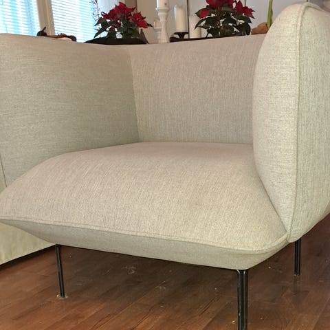 Bolian Cosima-sarjaan kuuluva kulmamoduuli beigellä kangasvehoilulla. Moduulin voi yhdistää sarjan muihin osiin tai sitä voi käyttää nojatuolina.