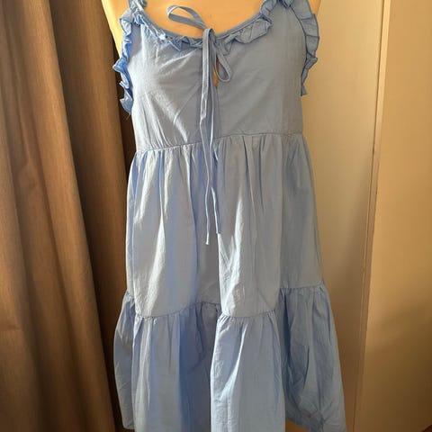 Kaunis kesämekko kevyttä kangasta, sinisellä pohjalla höyhenkuvioita, joissa koristetikkaus. Hienot yksityiskohdat!