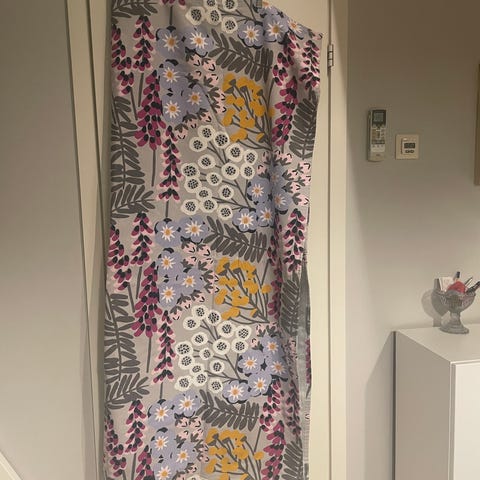 Myydään itse ommeltu verho, kuosina oranssi Pentik Haiku. Koko 241cm x 150cm. Verho pesty kerran, joten ei pitäisi enää kutistua. Verho ommeltu ylä- ja alareunoista.