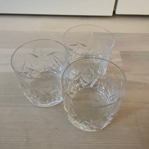 Design Kari Uusitalo, tuotannossa 1989-1995. Lasin korkeus on 6,6 cm ja suuaukon halkaisija 6,7 cm. Myynnissä yhteensä 4 kpl täysin ehjää, kirkasta ja oikein hyväkuntoista lasia, joissa kaikissa tallella 1980-luvun i-tarrat. Hinta on 4 lasin yhteishinta.