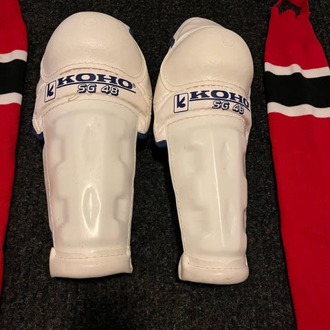 Valkoiset ja hyvässä kunnossa olevat vintage KOHO SG RINK PRO L 16 41 CM, jääkiekko- ja rullakiekkopolvisuojat. Suojia ei ole paljoa käytetty niiden ikään nähden ja ovat varsin hyvässä kunnossa.
