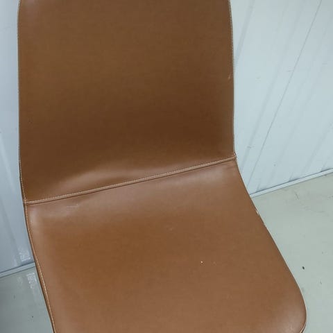 Kaksi tekonahkaista tuolin istuinosaa. Toisessa pinnassa lyhyt repeämä. Jalkoja siis ei ole ollenkaan.