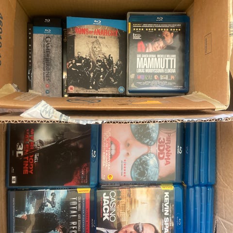 Nurkat tyhjiksi muuton alta. Bluray -elokuvia myyntiin, joukossa vuokrapoistoja jotka olleet ostettaessa uudenveroisia. Mukana paloja sarjoista kuten keräilyversio Sons of Anarchy (4 kautta USA versio region free). (…) Game of Thrones Seasons 1-2. Kaikki toimivat region 2 soittimella, suurin osa skandi-julkaisuja. Huom! Kuvan DVD-elokuvat myyty ei sis kauppaan.