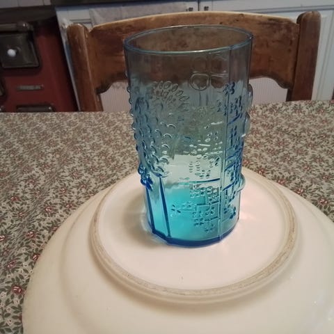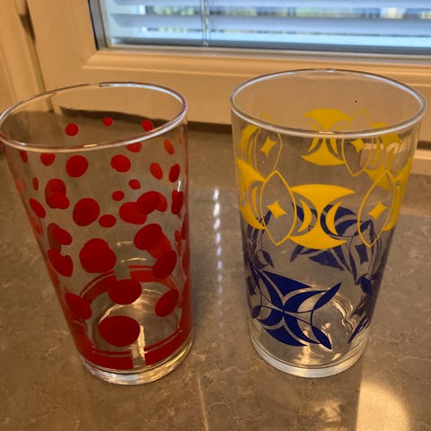 Uudenveroisessa kunnossa. Yhteishinta. Kaksi kappaletta. Korkeus 85 mm. Läpimitta 63 mm. Mehulasi kuvitettu printattu