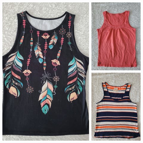 Kaksi toppia. Valkoinen Lindexin Holly&Whyte L koko. Rypyssä pesun jäljiltä mutta voi pitää off shoulder tai olalla. Sininen h&m L koko. Takana syvempi pääntie, voi pitää kummin päin vain.