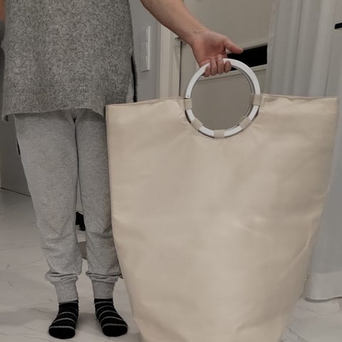 Pyykkisäkki jonka saa suljettua, kahvatkin kantamiseen. Menee kasaan. Tässä ei ole säilytetty likapyykkiä, vaan vierasvarapetivaatteita yms. kodin tavaraa. On siis siisti ja puhdas. Jyskin mallistoa, sieltä löytynee tarkat mitat. Vain nouto Salosta.