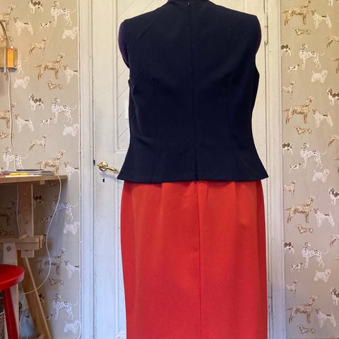 Tumma liituraitainen musta jakkupuku, samaa laadukasta sarjaa molemmat (Isabell Kristensen, hinta ollut uutena aikanaan muutaman satasen). Jakku kokoa M, hame L. Nuorekas malli, itse olen käyttänyt tätä parikymppisenä hautajaisissa ja firman juhlissa.