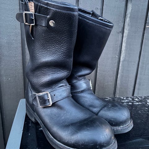 Paksua jämäkkää rasvanahkaa bikerit puolikorkea varsi, vedenpitävät, kiristettävä solki - on niin napakat, ettei solki paljoa vaikuta. Pohja ei ole kulunut YHTÄÄN. Jalkaan helpottamista varten vetolenkit molemmin puolin vartta. Lesti on tilava, pohja nahkaa. Nilkkakohta on naisille sopiva, ellei miespuolisella ole siro nilkka. Koko vastaa kokoaan, itsellä 40 jalka kun en halua nakkisukkaa ajaessa. Hyvä tuntuma vaihteisiin kuitenkin. Naarmuja hieman, voin suojavahata; näitä hoidettu sillä. Mp liikkeestä ovh 159€