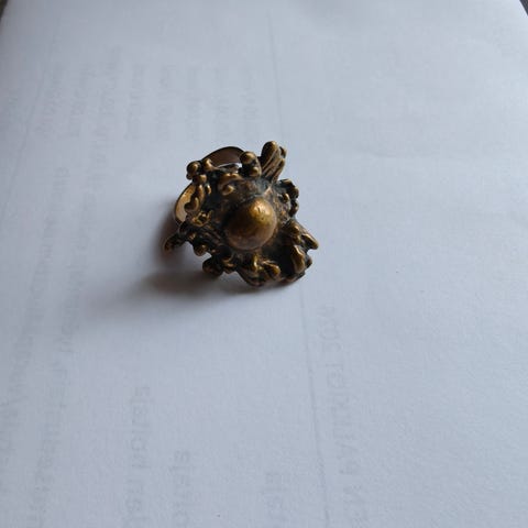 Vintage pronssinen taidekoru – sormus (1960–80-luku). Näyttävä ja persoonallinen pronssinen sormus, skandinaavista taidekorutyyliä. Epäsymmetrinen, rei’itetty etuosa ja kaunis vasaroitu pinta tekevät sormuksesta veistoksellisen ja modernistisen.