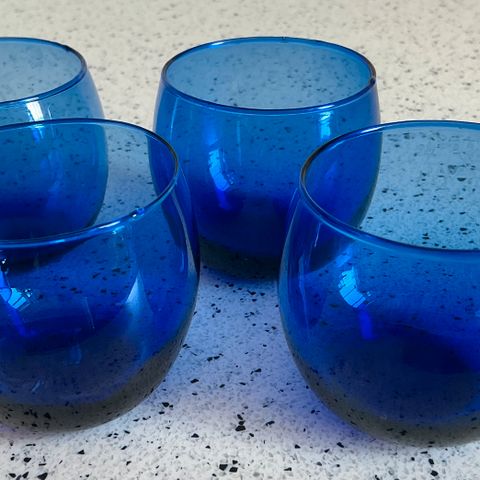 Vanhat vuosina 1956 - 1971 tuotannossa olleet, muottiin puhalletut lasit, suunnittelija Saara Hopea. Lasin kotkeus on 5,5 cm, halkaisija pulleimmillaan 6,2 cm ja tilavuus 10 cl. Lasit ovat täysin ehjät ja hyväkuntoiset. Laseissa on ilmakuplia ja yhden lasin reunassa ikäänkuin valunutta lasimassaa, ks. kuvat. Hinta on 5 lasin yhteishinta.