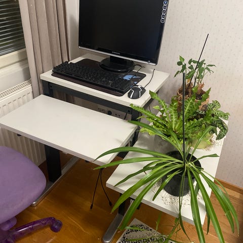 Pöydän korkeutta voi säätää, sopii seisomatyöskentelyyn. Pöydän kannen kaltevuutta saa säädettyä. Pöydän pyörät saa lukittua.