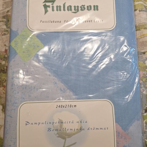 Kaksoisvuoteen peitto ja kaksi pussilakanaa, joista kahteen myös tyynyliinat.