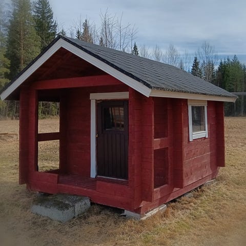 Höylähirren paksuus 45 mm ja korkeus noin 125 mm. Peltikatto, ehjä eli ei vuoda! Leikkimökin kokonaisleveys peltikatosta mitattuna 3,37 m ja pituus 3,17 m. Kokonaiskorkeus 1,9 m. Huoneen sisämitat: leveys 1,6 m ja pituus 1,7 m. Reunasta hirsien yläreunaan on huonekorkeus 1,5 m ja lattiasta kurkihirren alareunaan 1,58 m. Katto on siis korkeammalla kurkihirren molemmilla puolilla. Terassit ovat kahdella puolella. Irtorappu kuuluu myös kauppaan mukaan. Oven ikkuna on lasia, mutta muut ikkunat ovat akryylia ( turvallisuusasia!), kun ne saa auki ja lapsista on ollut ihanaa rämpätä ikkunoita auki ja kiinni kahvila- ja kioskileikeissä. Huoneen vasemmalla puolella on kiinteä penkki, jossa on kansi saranoilla. Sisään saa laitettua leluja. Penkki on todella tukeva ja kestää helposti ainakin kahden aikuisen istumisen (enemmillä aikuisilla ei ole testattu!). Oikealla puolella olevat puiset seinähyllyt kuuluvat kauppaan myös tuon kiinteän penkin kanssa. Verhot kuuluvat kauppaan. Lelut eivät kuulu hintaan lukuuottamatta nurkassa olevaa Frozen liettä. Ostaja huolehtii ja maksaa kuljetuksen. Tämä on siis hirttä eikä mikään lautakasa eli painoa on sen mukaisesti. Nouto Jyskästä. Klikkaamalla nimestäni näet muutkin minulla myynnissä olevat tavarat.
