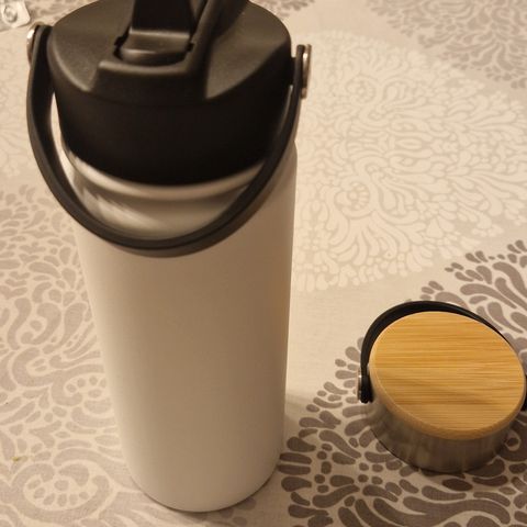Myydään ruostumattomasta teräksestä tehty käyttämätön termospullo. Kaksi eri korkkia (bambu- tai sporttikorkki). Molemmissa korkeissa muovinen kahva, josta pulloa on helppo kantaa.