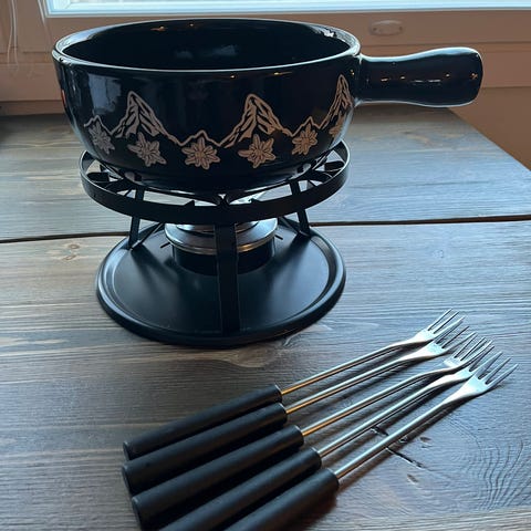 Fondue pannu, haarukat tiikki varrella 6 kpl, tarjoilu lautanen halkaisija 34 cm sekä erillinen tiikkiritilä. Nouto / lähetys ostajan lukuun.