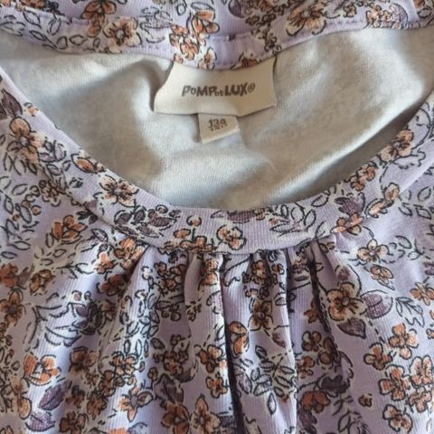 Pomp de lux mekossa kyynärpään kohdalla väri haalistunut ja punaista maalia toisessa hihassa. Ei vaikuta käyttöön. En huomannut tyttärellä, silloin kun ollut mekko päällä. Vasta nyt kun kuvasin.