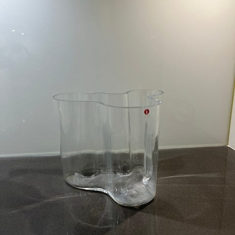 Kirkas Iittalan Aalto-maljakko, alkuperäinen laatikko ja esitevihkonen. Yhdessä kulmassa pohjassa pari pientä naarmua, ne kuvassa 3.