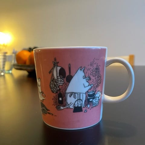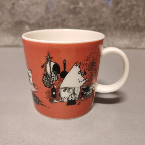 Arabia Muumimuki Tumma Roosa, tunnetaan myös nimillä Mammamuki, Roosa Mamma, ysärimamma, ysärimuki, Roosa Muumimamma.