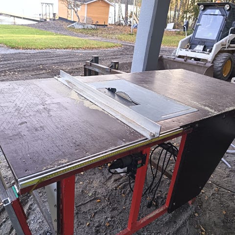 Keskon myymä privat label L&D MS210 katkaisusirkkeli erilaisilla kulmasäädöillä, laserilla ja liukupöydällä. Kuvassa olevan työpöydän saa mukaan.