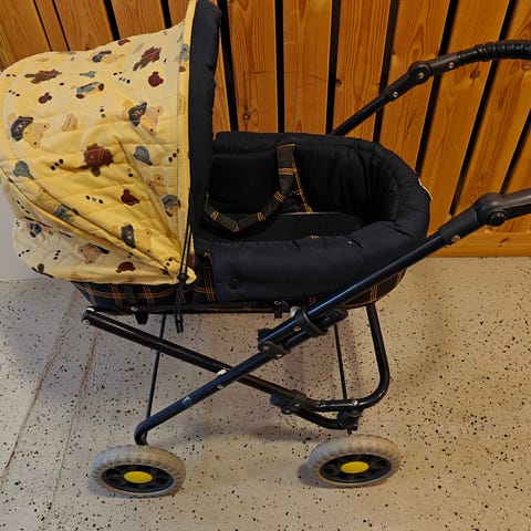 Nukenvaunut nallekuviolla. Työntökahva kääntyy pienemmänkin leikkijän korkeudelle. Yksi "sängynreunan" kiinnitysneppi ja kuomun ylhäällä pitämisnauhat katkenneet, niiden tilalle laitettu nauhat. Nuo puutteet ei haittaa käyttöä.